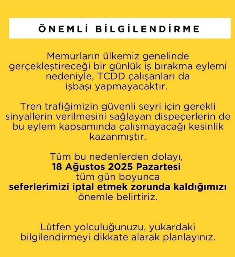 İZBAN'dan yapılan açıklamada, "Memurların ülke genelinde gerçekleştireceği 1 günlük iş bırakma eylemi nedeniyle TCDD çalışanları işbaşı yapmayacaktır. Bu nedenlerden dolayı 18 Ağustos 2025 Pazartesi tüm gün boyunca seferlerimizi iptal etmek zorunda kaldığımızı önemle belirtiriz" denildi.