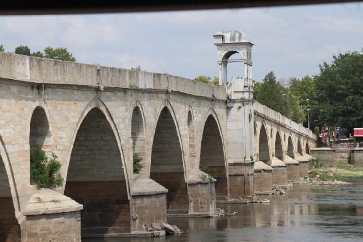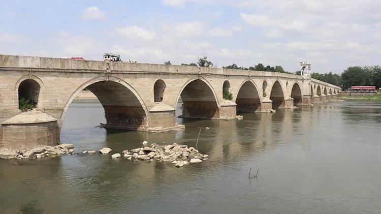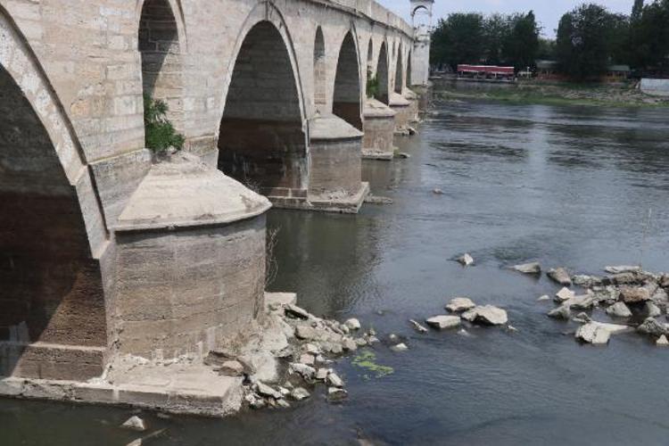 Edirne'de yaşanan kuraklık nedeniyle Meriç Nehri'nin debisi saatte 48 metreküp/saniyeye düşünce, tarihi Meriç Köprüsü'nün suya gömülü ayakları ortaya çıktı.