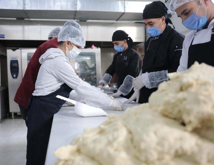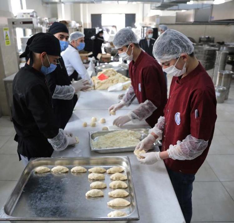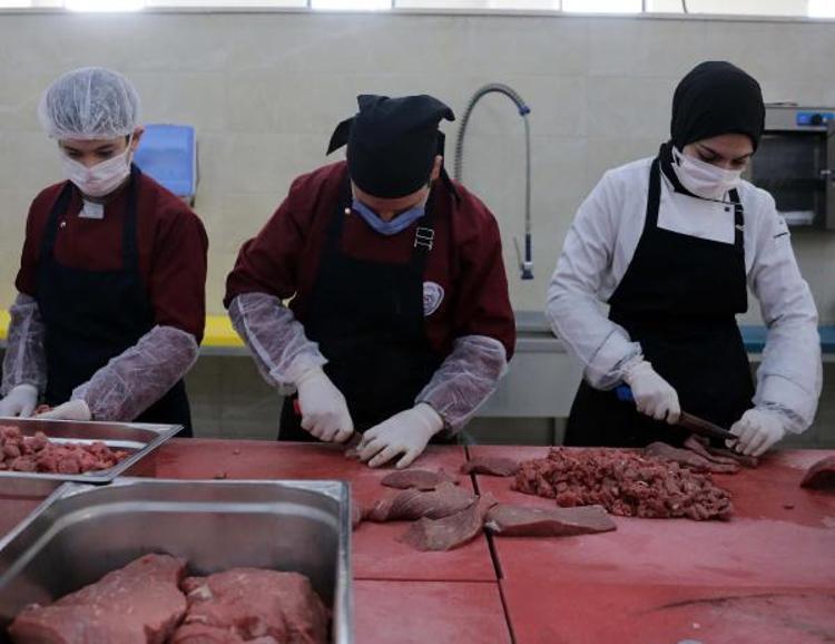 Okuldaki bin metrekarelik yemekhanede öğrenciler, günde 3 çeşit yemek yapıyor. Siparişler doğrultusunda üretim yapılan okulda öğrenciler hem mesleklerini geliştiriyor hem de para kazanıyor.