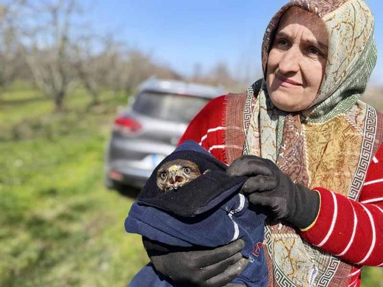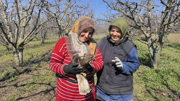 İlçenin kırsal Çeltikçi Mahallesi’ndeki meyve bahçesinde temizlik yapan mevsimlik işçiler, yerde yaralı halde şahin buldu. İşçilerden Elif Tokgöz, kanatlarından yaralanan şahini montuyla tutup yakaladı.