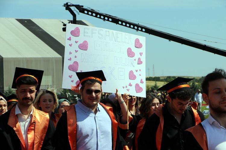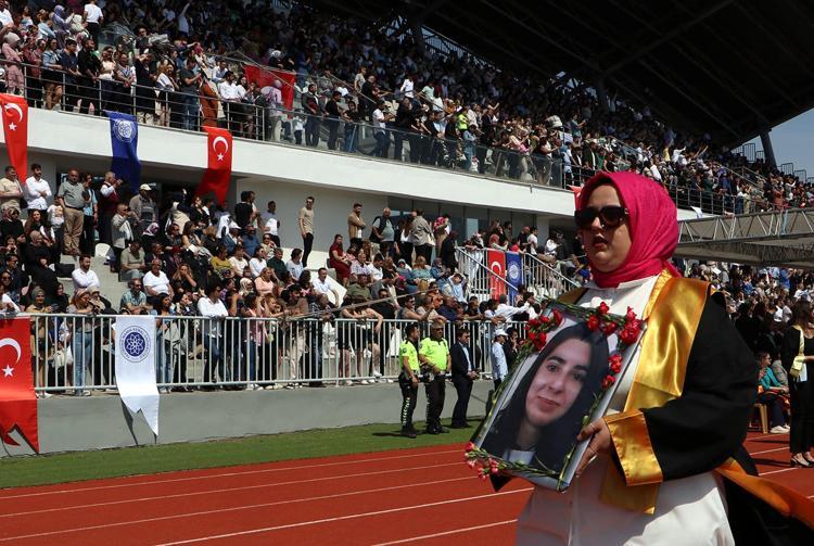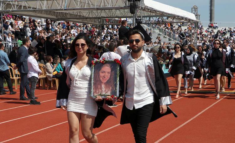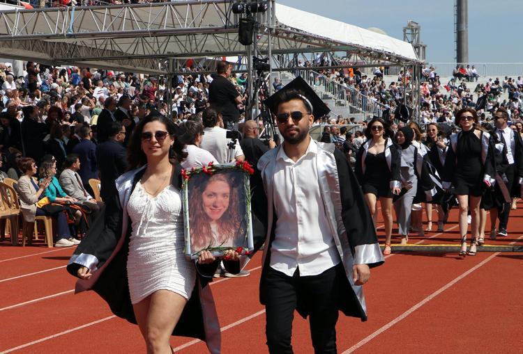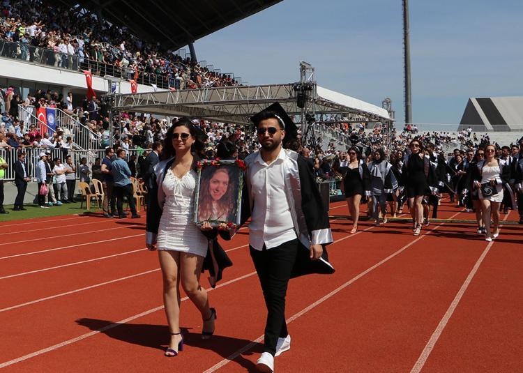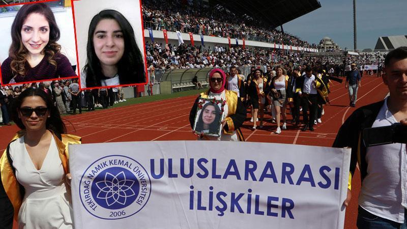 Tekirdağ Namık Kemal Üniversitesi'nin (NKÜ) mezuniyet töreninde öğrenciler, Kahramanmaraş merkezli depremde ölen arkadaşları Ayşe Cinkılıç ile Gülistan Aktürk'ün fotoğraflarını taşıdı.