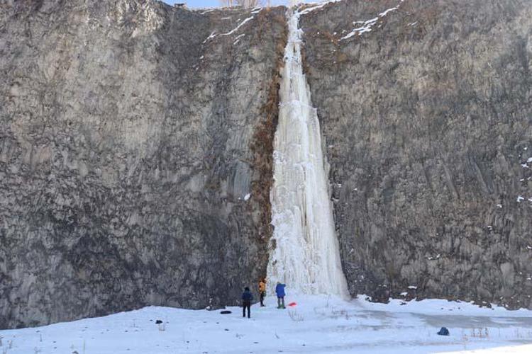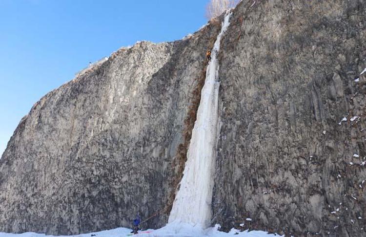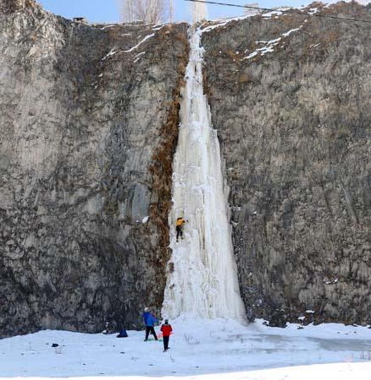 Dünyada 8 bin metreyi geçen 13 dağa çıkan milli dağcı Tunç Fındık, Ağrı'nın Diyadin ilçesindeki Murat Kanyonu'nda yaklaşık 50 metre yüksekliğindeki buzdan şelaleye tırmandı. Milli sporcu, kanyonun buz tırmanışları için ideal olduğunu söyledi.