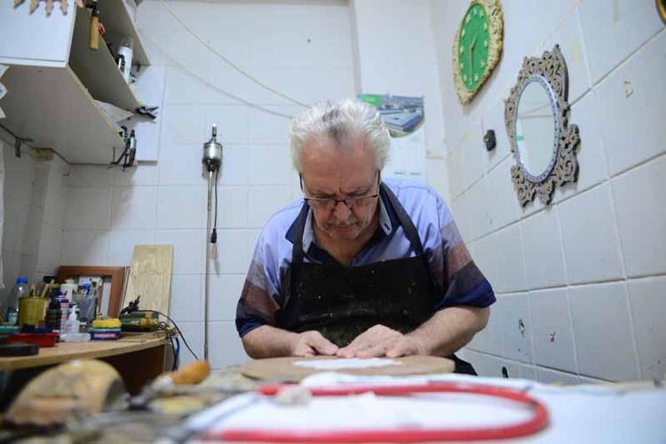 Hüseyin Kabacalı (69), bir dönem otel olarak da kullanılan handaki 25 dükkandan birinde, emekli olduktan sonra, hat sanatıyla yazılan yazıların oyma, kakma, kabartma ve yakma teknikleriyle ahşaba işlenmesiyle ortaya çıkan desenin veya motifin, ahşap oyma ve işleme teknikleriyle ayrıştırılmasıyla oluşan naht sanatıyla uğraşıyor.