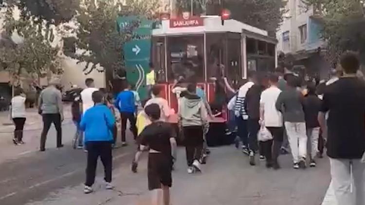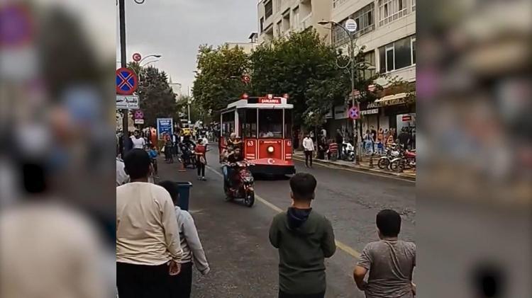 Şanlıurfa’da motosikletli iki genç, seyir halindeyken sürücünün kontrolü kaybetmesi sonucu nostaljik tramvayın önünde devrildi. Vatmanın ani refleksi motosikletlileri tramvayın altında kalmaktan son anda kurtarırken, bu anlar cep telefonu kamerasına yansıdı.