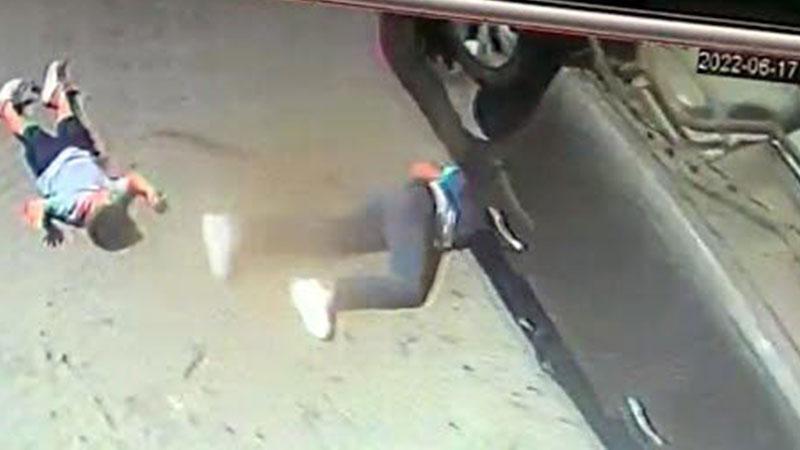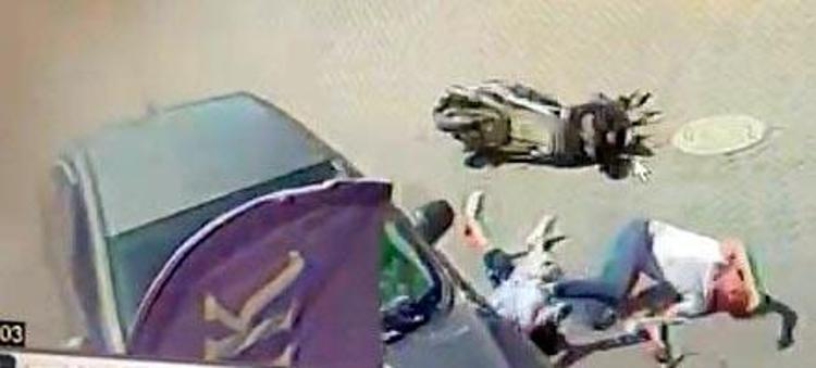 Manisa'nın Turgutlu ilçesinde, otomobilin çarptığı motosikletteki Atilla Çetin (36) ile oğlu Talha (8), aracın altına girmekten son anda kurtuldu. Otomobilin de takla attığı kaza, güvenlik kamerasına yansıdı.