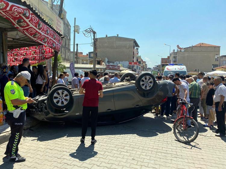 Çarpmanın şiddetiyle yola savrulan kasksız motosikletli Atilla Çetin ve arkasındaki oğlu Talha Çetin, yola fırladı. Baba-oğul, takla atan otomobilin altında kalmaktan son anda kurtuldu. Kazayı yara almadan atlatan otomobil sürücüsü Tunay Araz da araçtan kendisi çıktı.
