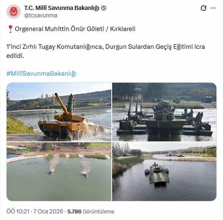 Milli Savunma Bakanlığı (MSB), Kırklareli'de bulunan Orgeneral Muhittin Önür Göleti'nde 1'inci Zırhlı Tugay Komutanlığınca, 'Durgun Sulardan Geçiş Eğitimi' gerçekleştirildiğini duyurdu.