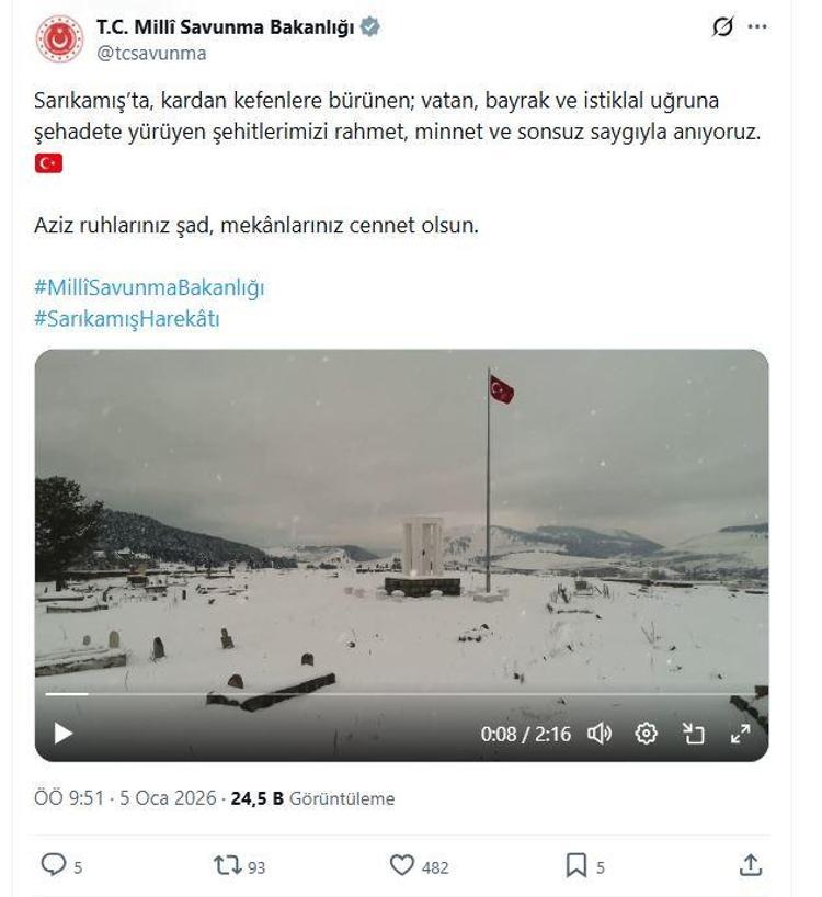 Bakanlığın sanal medya hesabından yapılan paylaşımda, "Sarıkamış’ta, kardan kefenlere bürünen; vatan, bayrak ve istiklal uğruna şehadete yürüyen şehitlerimizi rahmet, minnet ve sonsuz saygıyla anıyoruz. Aziz ruhlarınız şad, mekanlarınız cennet olsun" ifadeleri kullanıldı. Videoda, 1914 yılındaki Sarıkamış Harakatı'na ilişkin tarihi görüntülere yer verildi.