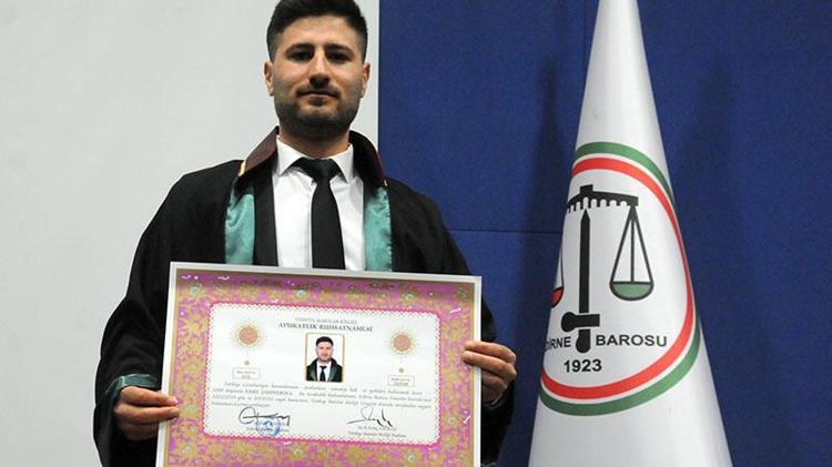 Edirne Barosu'nda düzenlenen törenle meslek yemini edip cübbe giyen Emre Şahin Erol, avukatlık ruhsatını Edirne Barosu Başkan Yardımcısı Aygün Ulubey Ergüden'in elinden aldı. Erol'u, törende mübaşir ve adliye çalışanı arkadaşları da yalnız bırakmadı. Emre Şahin Erol, pandemi dönemini fırsat bilip KPSS'ye hazırlandığını belirterek, "Kırklareli Üniversitesi Hukuk Fakültesi'ni kazanmamın ardından 6 ay okula gittikten sonra pandemi ortaya çıktı. Sonra eve kapanma dönemi başlayınca, mübaşir olmak için KPSS'ye hazırlanmaya karar verdim.