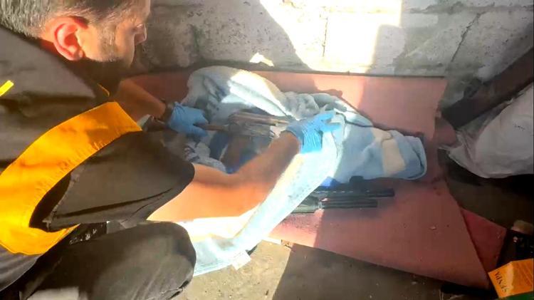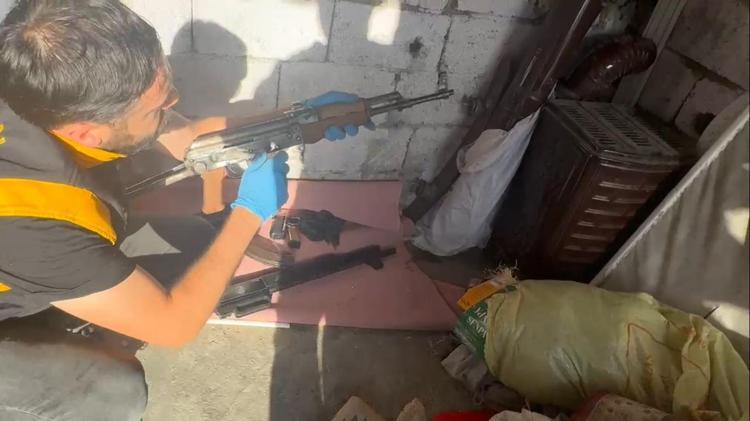 Önceki gün iki katlı müstakil eve baskın yapan ekipler, odunlukta bebek battaniyesine sarılı makineli tüfek, otomatik tüfek, tabanca ve şarjörler ele geçirdi. Mustafa Y., "Silahlar benim değil, kim koydu bilmiyorum" dedi. Bunun üzerine polis ekipleri, ikinci katta oturan komşusu Hakan S.'yi de gözaltına aldı.