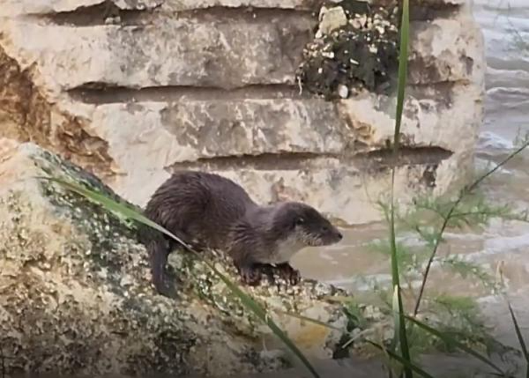 Derenin kenarındaki kayalık alana çıkıp tekrar suya dalan su samurları, çevredekilerin cep telefonu kamerasıyla görüntülendi.