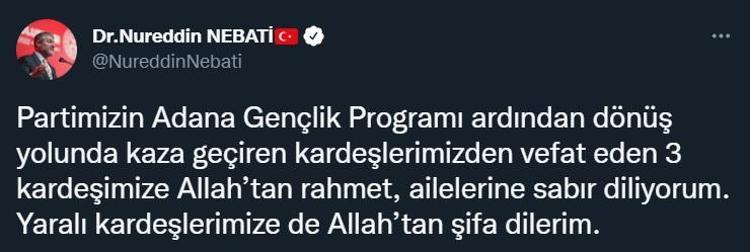 Hazine ve Maliye Bakanı Nureddin Nebati ise şu açıklamayı yaptı:"Partimizin Adana Gençlik Programı ardından dönüş yolunda kaza geçiren kardeşlerimizden vefat eden 3 kardeşimize Allah'tan rahmet, ailelerine sabır diliyorum. Yaralı kardeşlerimize de Allah'tan şifa dilerim."