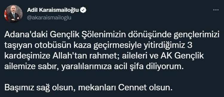 Ulaştırma ve Altyapı Bakanı Adil Karaismailoğlu, "Adana'daki Gençlik Şölenimizin dönüşünde gençlerimizi taşıyan otobüsün kaza geçirmesiyle yitirdiğimiz 3 kardeşimize Allah'tan rahmet; aileleri ve AK Gençlik ailemize sabır, yaralılarımıza acil şifa diliyorum. Başımız sağ olsun, mekanları Cennet olsun" açıklamasında bulundu.
