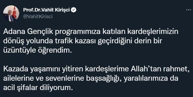 Tarım ve Orman Bakanı Vahit KiriÅŸci de Twitter'daki hesabından ÅŸu mesajı paylaÅŸtı:"Adana Gençlik Programımıza katılan kardeÅŸlerimizin dönüş yolunda trafik kazası geçirdiÄŸini derin bir üzüntüyle öğrendim. Kazada yaÅŸamını yitiren kardeÅŸlerime Allah'tan rahmet, ailelerine ve sevenlerine baÅŸsaÄŸlığı, yaralılarımıza da acil ÅŸifalar diliyorum."Â