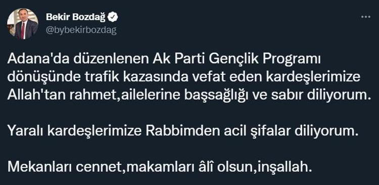 Adalet Bakanı Bekir BozdaÄŸ, "Adana'da düzenlenen AK Parti Gençlik Programı dönüşünde trafik kazasında vefat eden kardeÅŸlerimize Allah'tan rahmet, ailelerine baÅŸsaÄŸlığı ve sabır diliyorum. Yaralı kardeÅŸlerimize Rabbimden acil ÅŸifalar diliyorum. Mekanları cennet, makamları ali olsun, inÅŸallah" mesajını paylaÅŸtı.Â