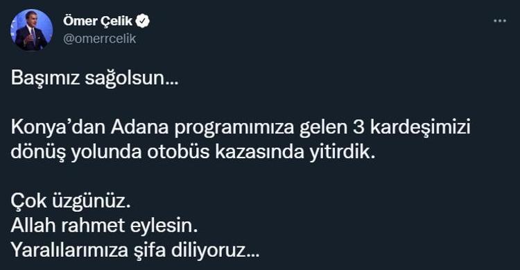 AK Parti Sözcüsü Ömer Çelik, Twitter hesabından yaptığı açıklamada, "Başımız sağ olsun. Konya'dan Adana programımıza gelen 3 kardeşimizi dönüş yolunda otobüs kazasında yitirdik. Çok üzgünüz, Allah rahmet eylesin. Yaralılarımıza şifa diliyoruz" dedi.