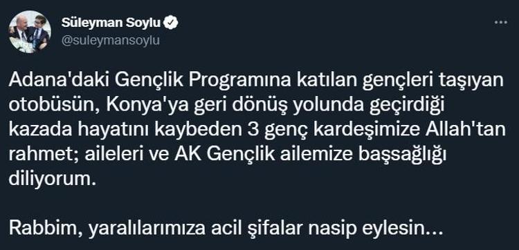 İçişleri Bakanı Süleyman Soylu, kazaya ilişkin, "Adana'daki Gençlik Programı'na katılan gençleri taşıyan otobüsün, Konya'ya geri dönüş yolunda geçirdiği kazada hayatını kaybeden 3 genç kardeşimize Allah'tan rahmet; aileleri ve AK Gençlik ailemize başsağlığı diliyorum. Rabbim, yaralılarımıza acil şifalar nasip eylesin" açıklamasında bulundu.
