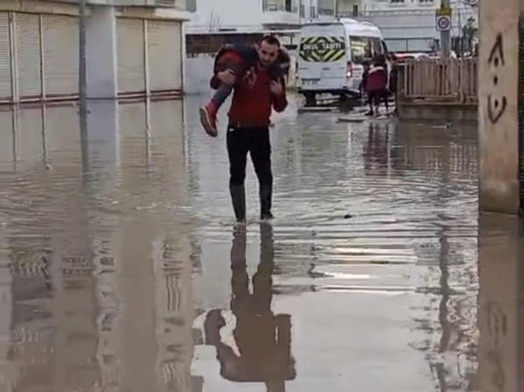 Mahallelerde bulunan bazı okulların bahçelerinde su birikintileri oluştu. Okul bahçelerinde mahsur kalan bazı öğrenciler kepçe yardımıyla güvenli alanlara taşınırken, bazıları da çocukları omuzlarında taşıyarak su dolu alanlardan geçirdi.
