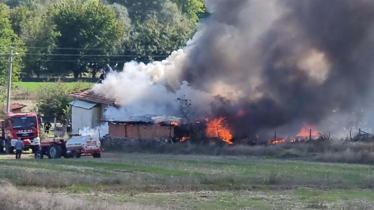 Odunlukta çıkan yangında evin bir bölümü ile traktör ve motosiklet de yandı