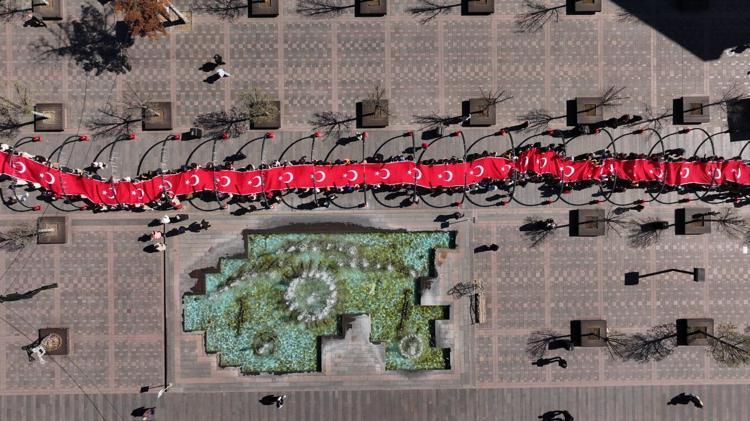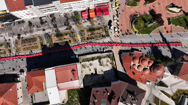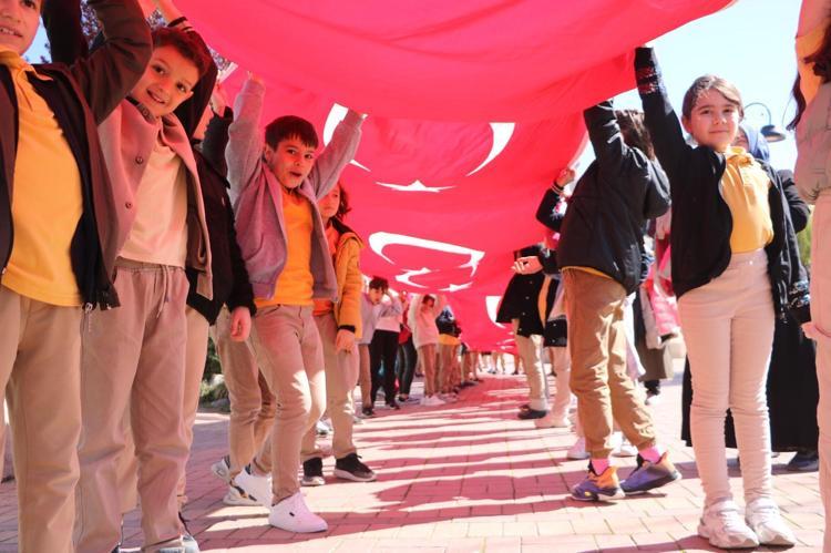 Öğrenci ve velileri ile öğretmenler 200 metrelik Türk bayrağıyla yürüdü