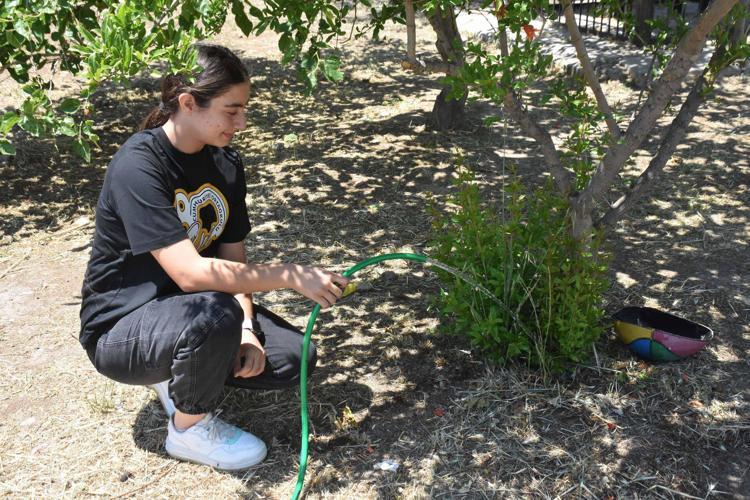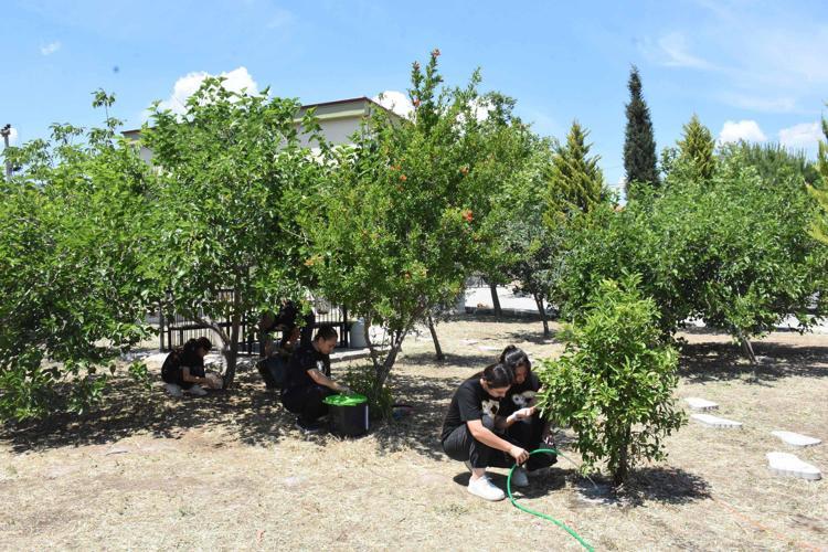 Öğrenciler, kurumasın diye okul bahçesindeki ağaçları yağmur hasadı yöntemi ile suluyor