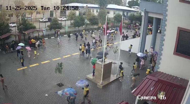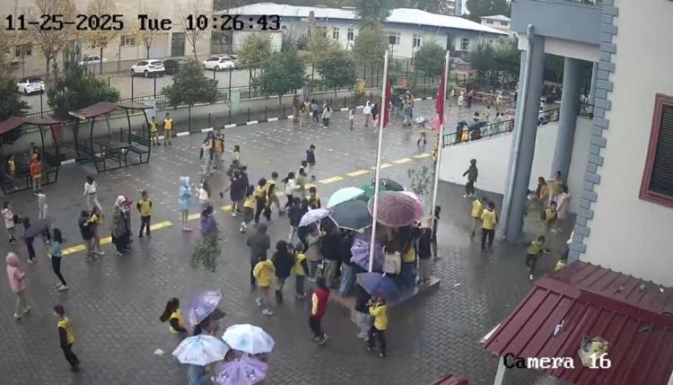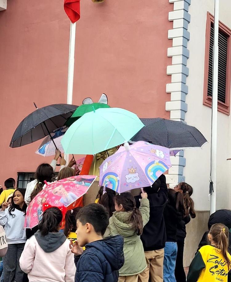 İlçedeki Zahit Çetin İlköğretim Okulu’nda dün ders gören öğrenciler teneffüse çıktıkları sırada aniden yağmur bastırdı. Bahçedeki 2 öğrenci şemsiyelerini Atatürk büstünün üzerine tutarak korumaya aldı.