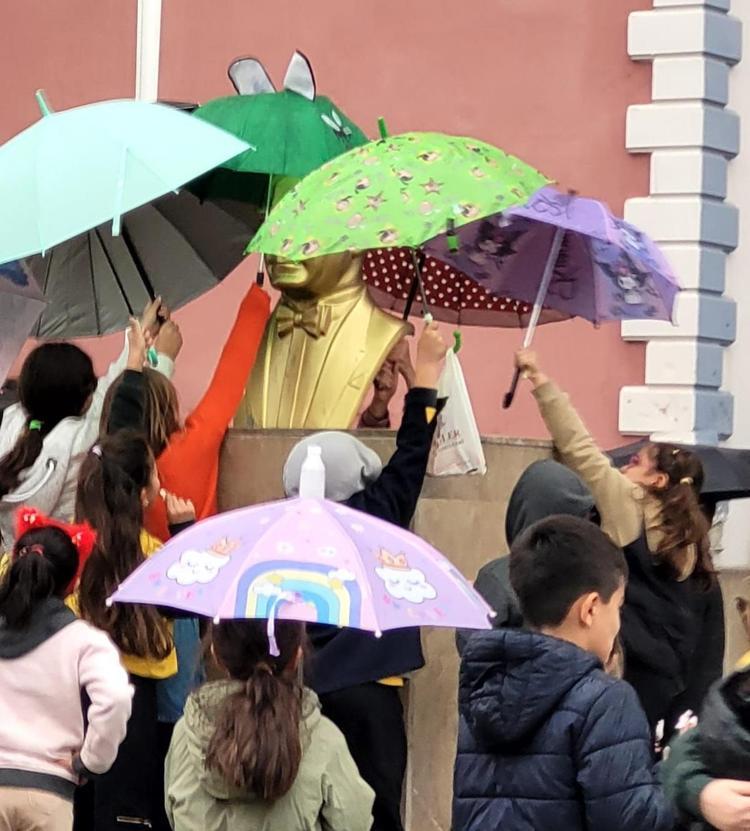 Ders zili çalsa da bazı çocukların büstü bırakmayıp şemsiye ile Atatürk büstünü koruduğu görüldü.