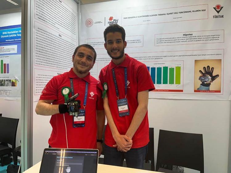 TOKİ Aliya İzzetbegoviç Anadolu İmam Hatip Lisesi 11'inci sınıf öğrencileri Mousa Matını ve Moaz Alsharıf, işitme engelli bireylerin iletişim kurmakta zorlanması nedeniyle flex sensörlü ve elektronik tabanlı işaret dili tercümanı eldiveni geliştirdi.