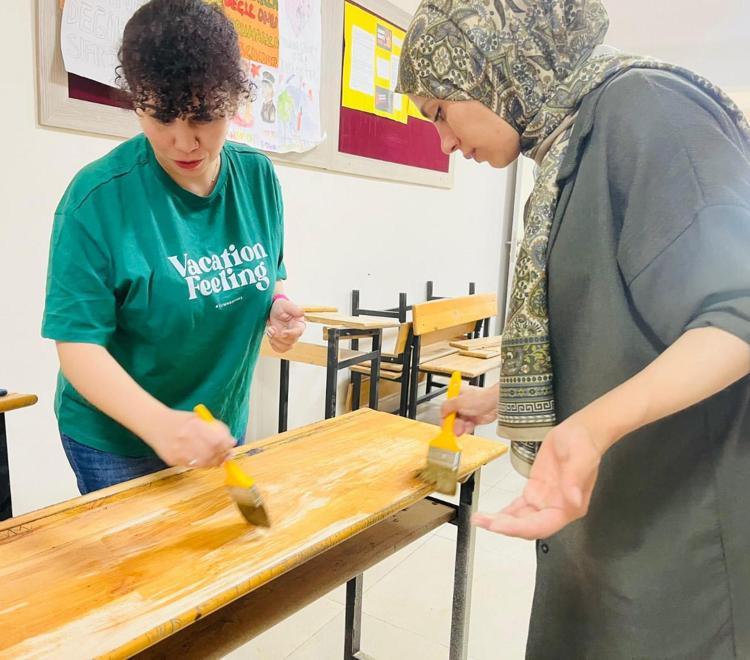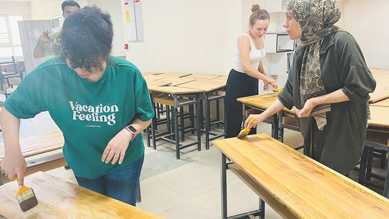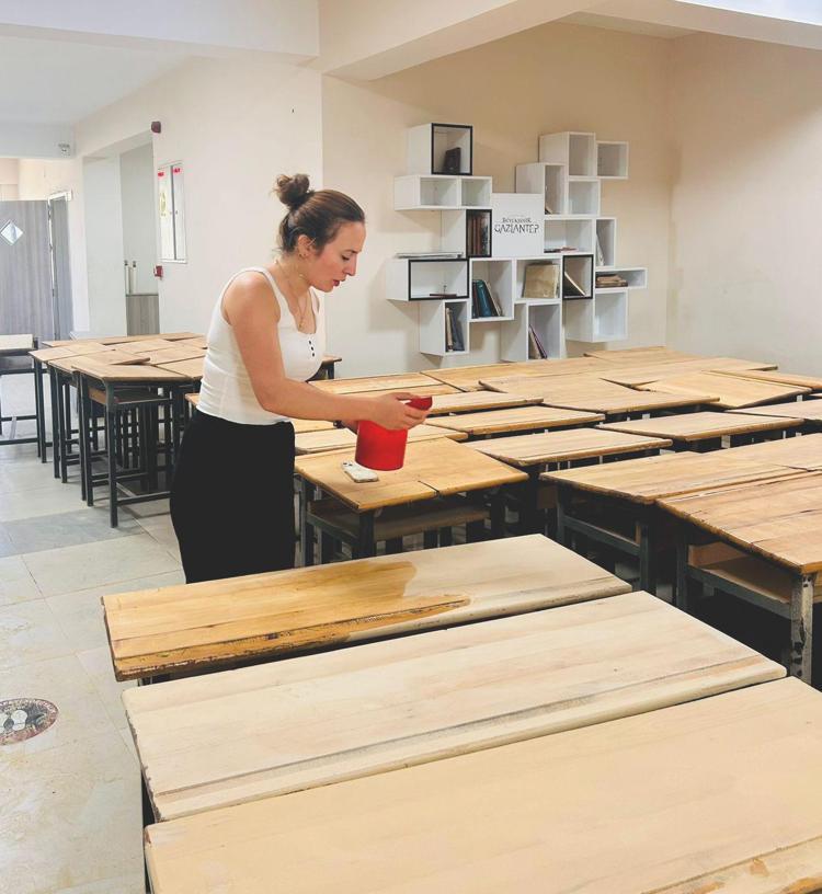 Gaziantep’in İslahiye ilçesindeki Boğaziçi Atatürk Anadolu Lisesi’nin öğretmenleri, okulun duvarlarını boyayıp, sıralarının tadilatını yapıyor.