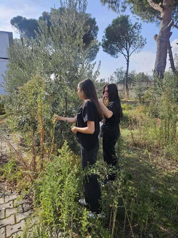 Okul bahçesinde öğrencilerden zeytin hasadı