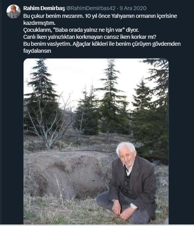 "Bu çukur benim mezarım olacak. 15 yıl önce Yahya’mın ormanının içerisine kazdırmıştım. Biraz deforme oldu. Ömrüm olursa baharın bir çeki düzen vereceğim. Çocuklarım, 'Baba orada yalnız ne işin var?' diyorlar. Canlı iken yalnızlıktan korkmayan, cansız iken korkar mı? Ağaçlar kökleri ile benim çürüyen gövdemden faydalansın. Ağaçlar üzerinde çeşitli kuşlar memleket şarkıları söylesin. O zaman ruhum şad olur. Bu benim vasiyetim."