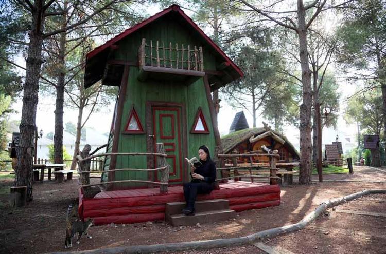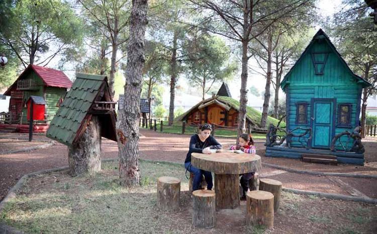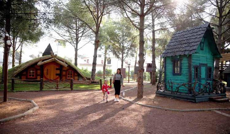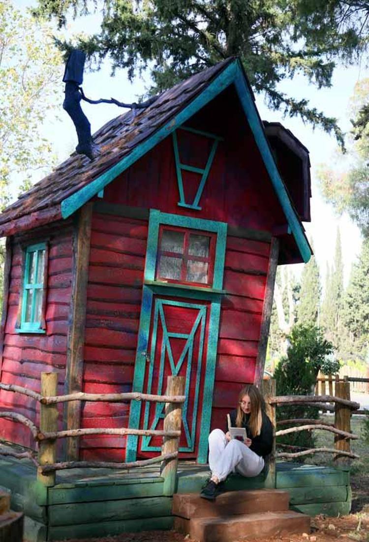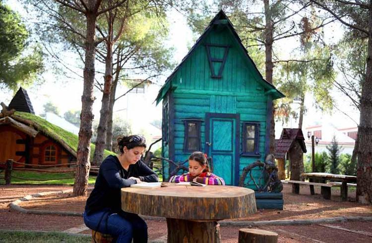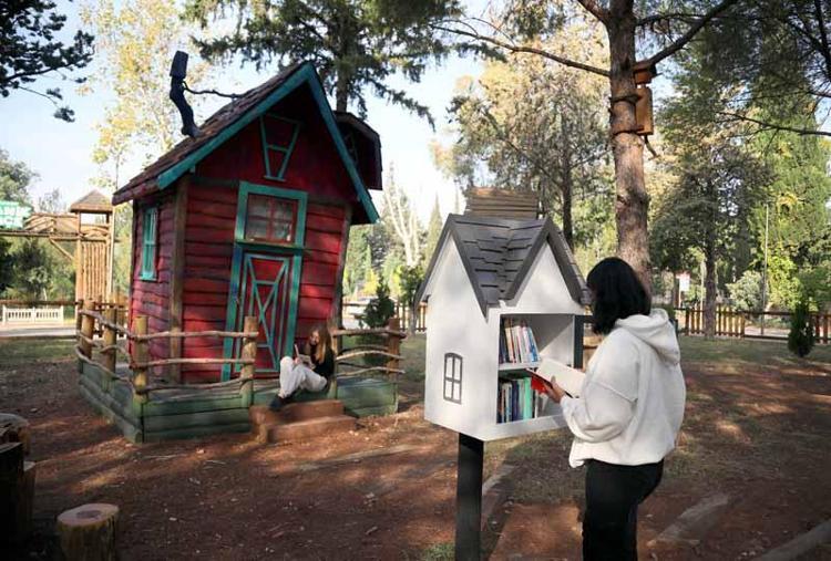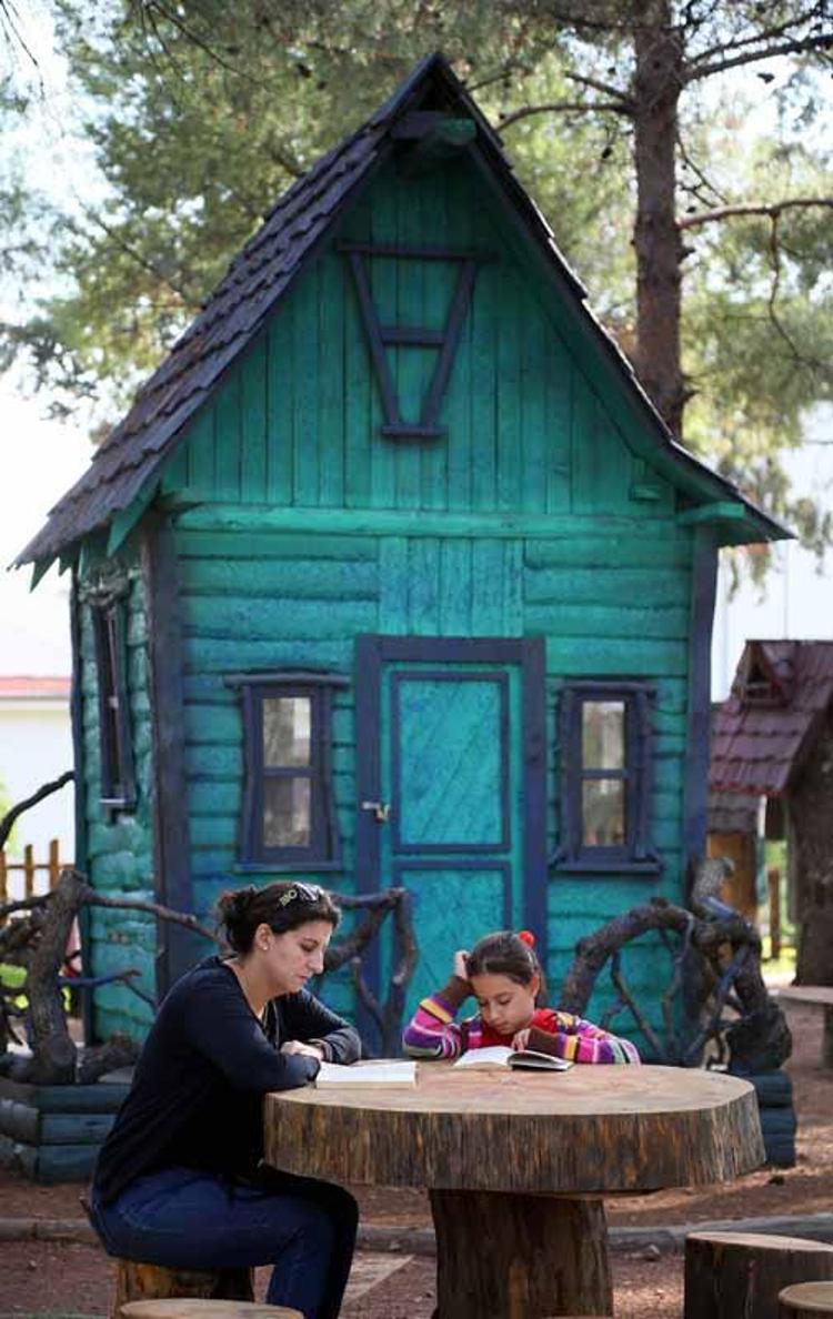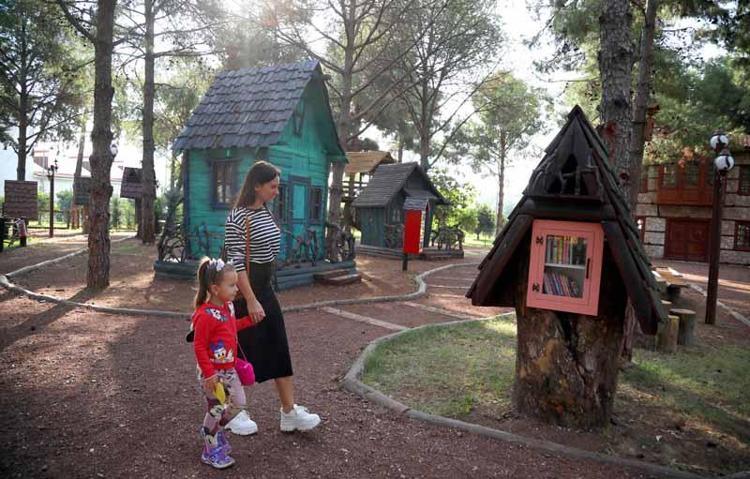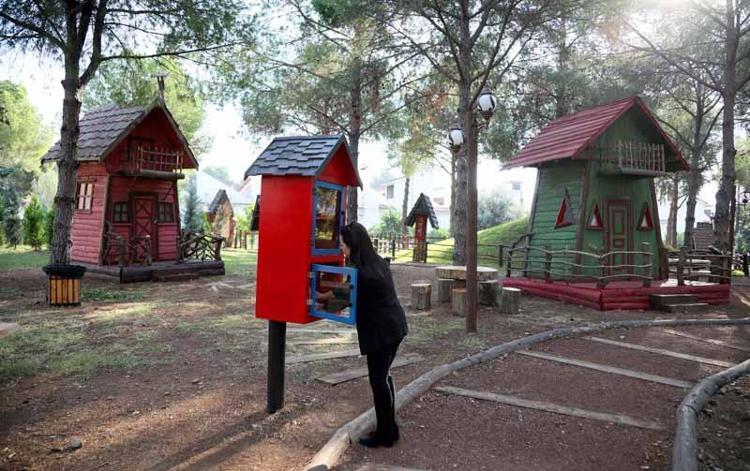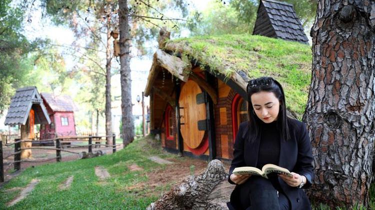 Kuş sesleriyle huzurlu ortamın olduğu kütüphanede, Antalya'nın Akseki ilçesinin geleneksel Osmanlı mimarisini yansıtan 300 yıllık geçmişe sahip düğmeli evin replikası ile 7 masal ve 1 hobbit evi de bulunuyor.