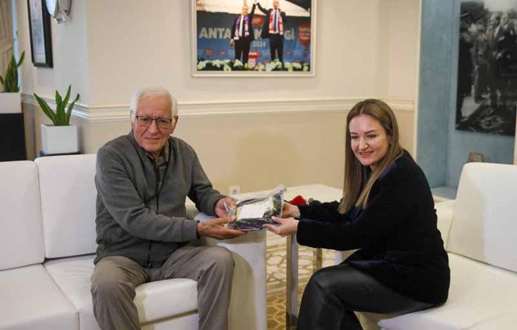 10 yıldır Büyükşehir Belediyesi'nde çalışan şoför Yevlal ve Gedik'i makam odasında ağırlayan Özdemir, çantasını Gedik'e verirken, şoför Yevlal'a da teşekkür belgesi verdi.