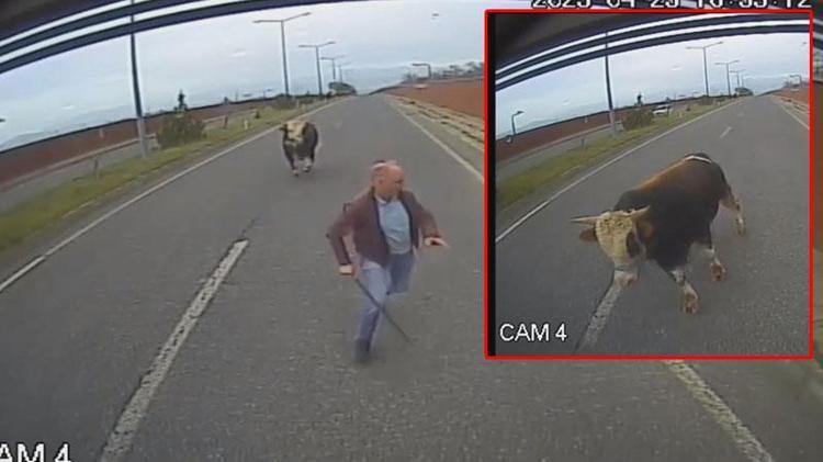Otobüs şoförü, yola çıkan boğanın saldırısına uğradı; o anlar kamerada