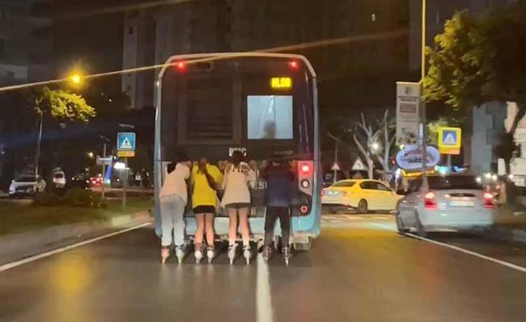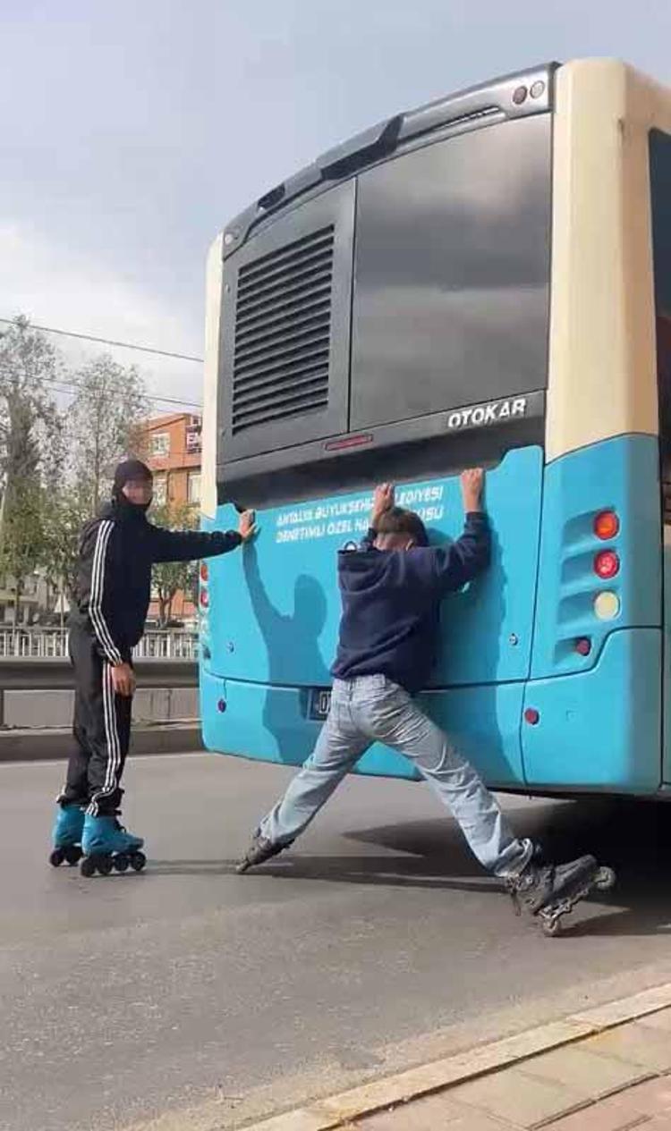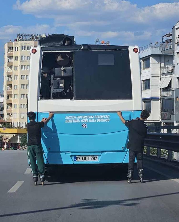 Antalya'da patenli çocukların halk otobüslerinin arkasına tutunarak yolculuk yapması, hem kendi canlarını hem de trafikteki diğer sürücüleri tehlikeye atıyor. Bu duruma dikkati çekmek isteyen 07 AU 0220 plakalı halk otobüsünün şoförü, farkındalık yaratacak bir yönteme başvurdu.