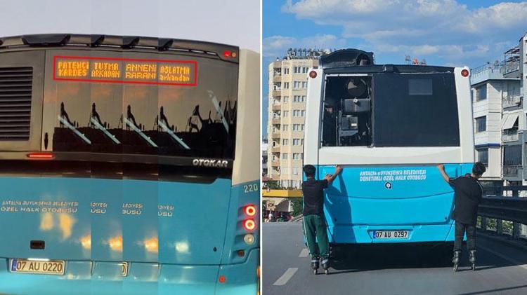Antalya'da patenli çocukların seyir halindeki otobüslerin arkasına tutunarak trafikte ilerleme tehlikesine karşı bir şoförün aracın arkasına 'Patenci kardeş, tutma arkadan, anneni babanı ağlatma arkandan' yazısının yer aldığı LED tabela asması dikkati çekti.