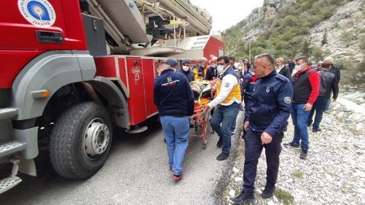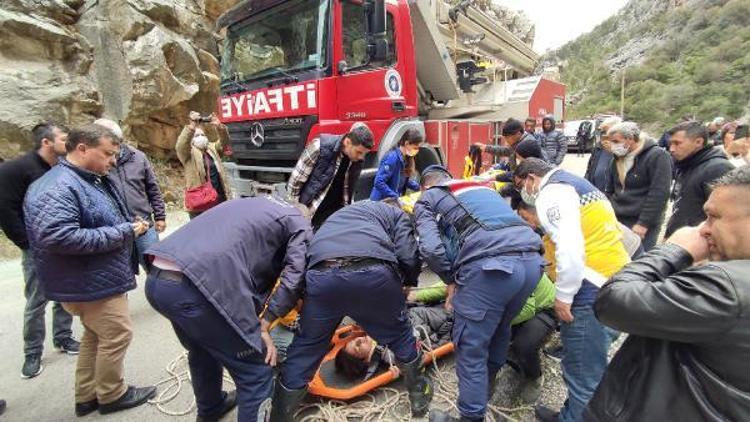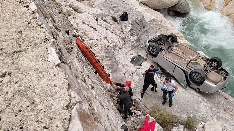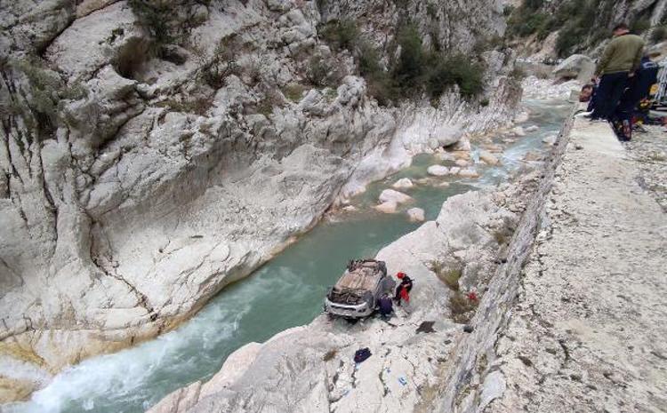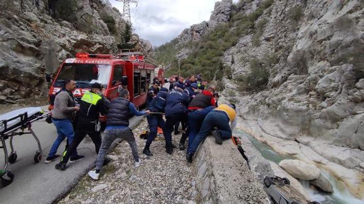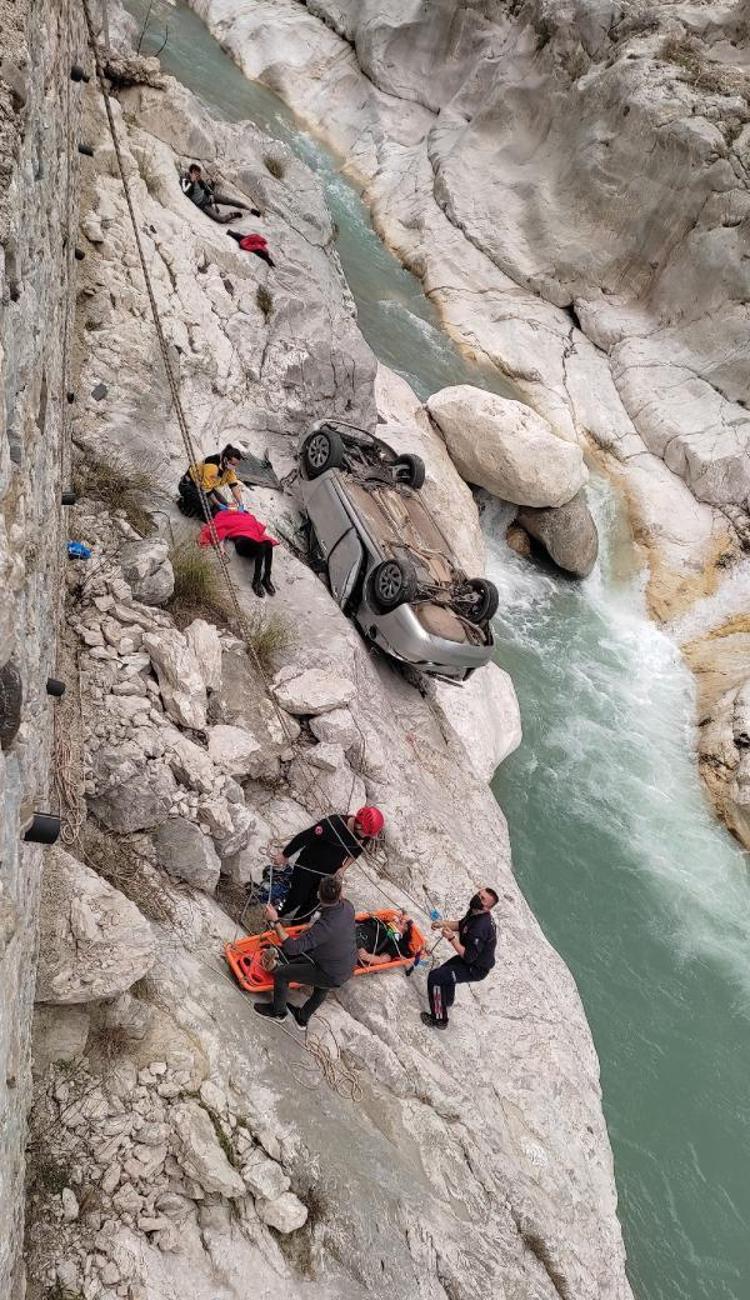 Antalya'da, 4 arkadaşın içinde olduğu otomobil, kontrolden çıkıp, 7 metreden dere yatağındaki kayalığa düştü. Sürücünün dereye düşüp, yaralandığı kazada ters dönen otomobildeki 3 yaralı da sedyeye bağlanan halatla yukarı çekildi.