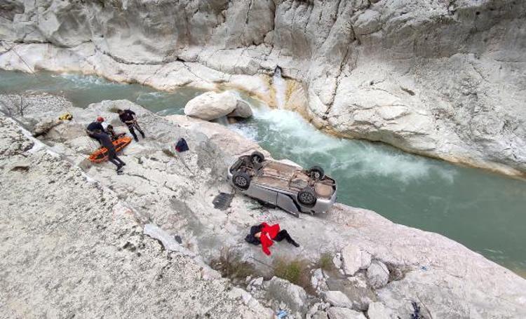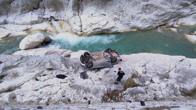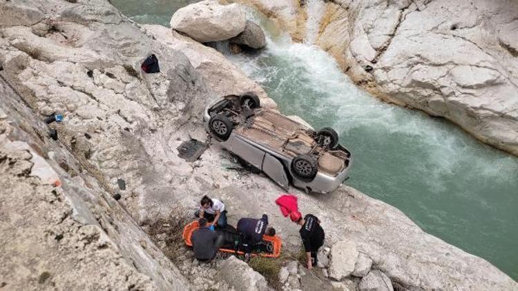 7 metreden dere yatağındaki kayalığa düşen otomobil, ters döndü.