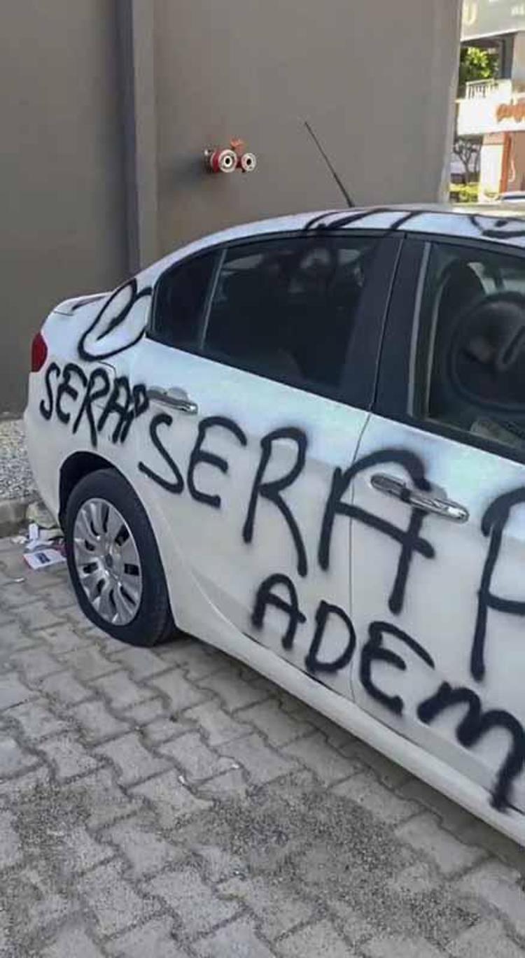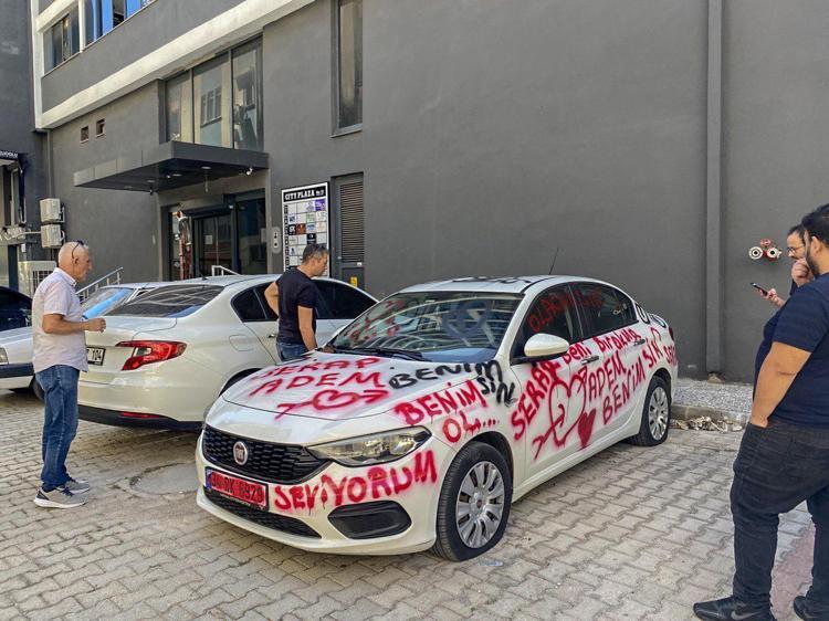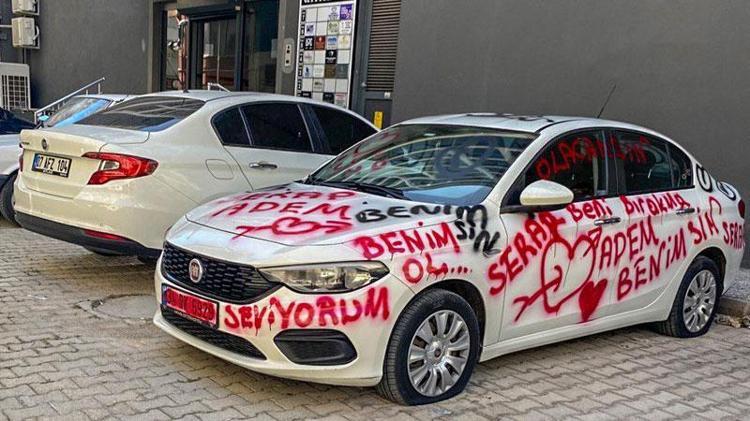 Antalya'da park halindeki bir otomobilin üzerine sprey boya ile kalp işaretleri çizilip, 'Serap, Adem, seni seviyorum, beni bırakma, benimsin' gibi yazılar yazıldı, lastikleri de kesildi.