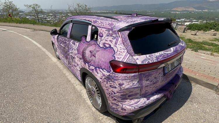 Bursa’da yaşayan ve 10 yıldır hayatının her alanında mor rengi kullanmayı tercih eden Firdevs Çakar (41), 1 yıl önce aldığı Togg marka aracını da sıra dışı yöntemle dönüştürdü. Otomobilini, Türk pasaportunda yer alan ve sadece ultraviyole ışık altında görünür hale gelen Türkiye'ye özgü simgesel yapılar ve desenlerle dokunan mor renkli halıyla kaplatan Çakar, “Yolda görenler durdurup fotoğraf çektiriyor. Türk aracına yakışır bir kaplama oldu” dedi.
