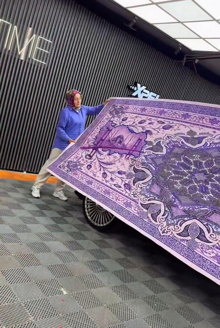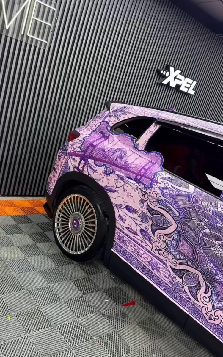 Otomobilini Türk motiflerinin yer aldığı mor renkli halıyla kapladı