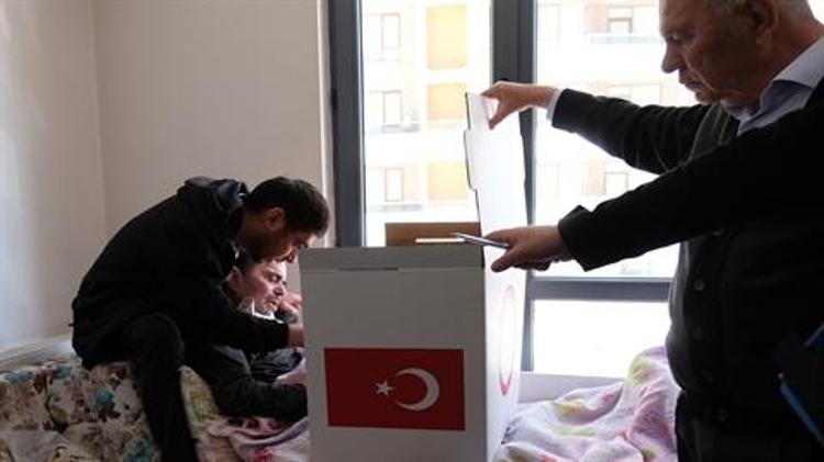 Hasta veya engelli vatandaşlar için oluşturulan seyyar sandıklar da evlere götürüldü. Felçli olan Ahmet Ateş (51) hasta yatağında yakınlarının yardımıyla oy kullandı.