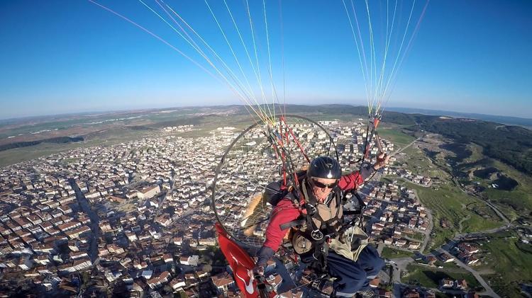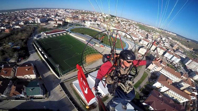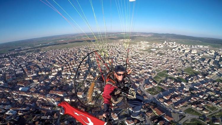 Keşan'da paramotor pilotu Yılmaz Özkaya, 18 Mart Şehitleri Anma Günü ve Çanakkale Zaferi dolayısıyla paramotoruna bağladığı dev Türk bayrağıyla şehrin üzerinde yaklaşık 1 saatlik uçuş gerçekleştirdi.