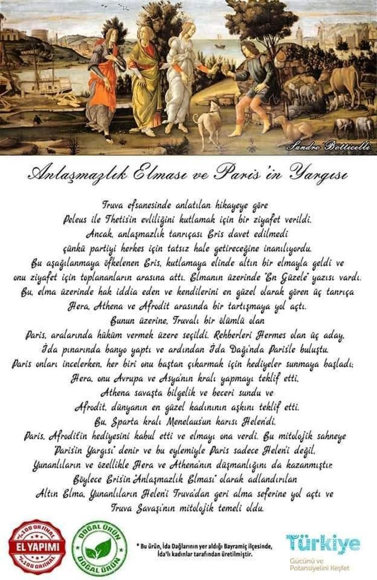 İlçe Halk Eğitimi Merkezi’ndeki kadın kursiyerlerin ürettiği altın elmaları içine koydukları kutuların üzerinde de efsanenin Türkçe ve İngilizce olarak anlatıldığını söyleyen Kaymakam Alper Taş, "Biz Troya hikayesinin özellikle İda’da geçen bu kısmını vurgulamanın önemli olduğunu düşünüyoruz. Çünkü Troya efsanesini anlamak için herkesin bu olayın başladığı İda’ya, yani Kazdağları'na gelmesi gerekiyor.