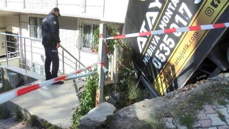 Eşyaların boşaltıldığı sırada içinde şoförü olmayan kamyon kaymaya başladı. Kamyonun kasasındaki iki kişi kamyondan atlarken, hızlanan kamyon bir apartmanın önündeki boşluğa düşerek durdu.