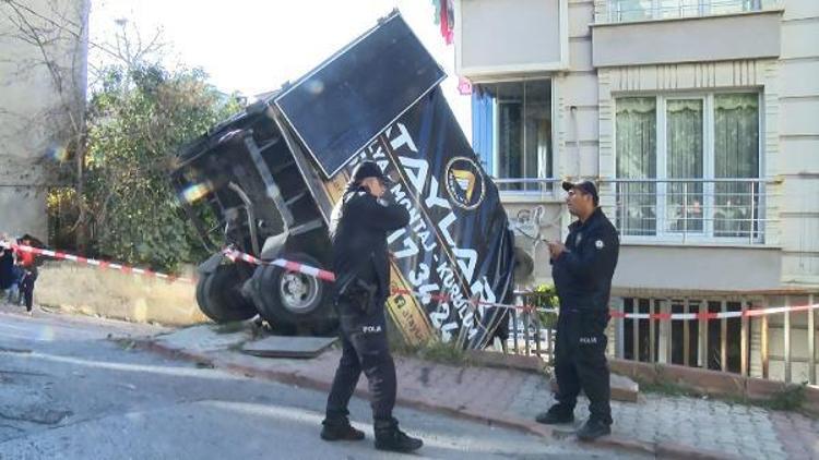 Sancaktepe’de kasasındaki eşyaların boşaltılması için yokuşa park edilen kamyon, kaymaya başladı. Kamyonun kasasındaki iki kişi son anda atlarken, hızlanan kamyon bir apartmanın önündeki boşluğa düştü. Kazada şans eseri ölen ya da yaralanan olmadı.