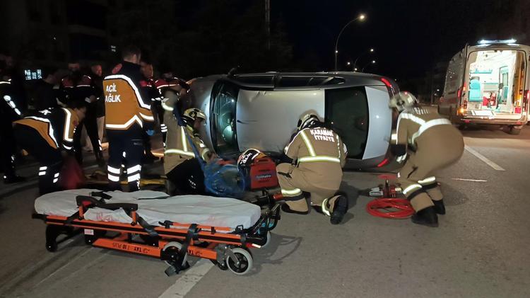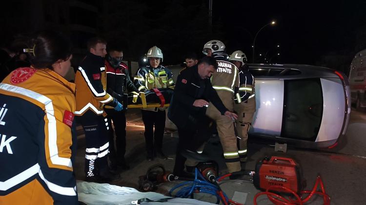 Karaman'da yönetimindeki otomobille, park halindeki başka bir otomobile çarpıp takla atan sürücü Fatma Kara (31), mahsur kaldığı araçtan itfaiye yardımıyla çıkarıldı.