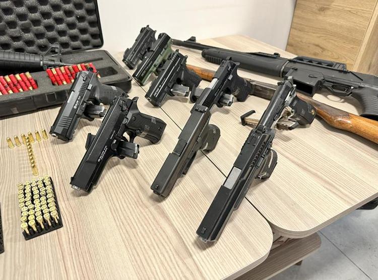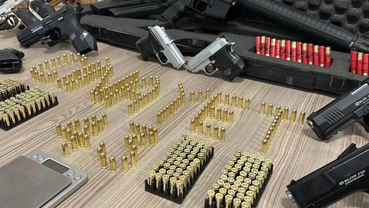 Evlerde yapılan aramalarda 27 ruhsatsız tabanca, 6 ruhsatsız av tüfeği, kurusıkı tabanca, 1600 tabanca fişeği, 45 kurusıkı tabanca fişeği, 23,04 gram kenevir tohumu, hassas terazi ele geçirildi.