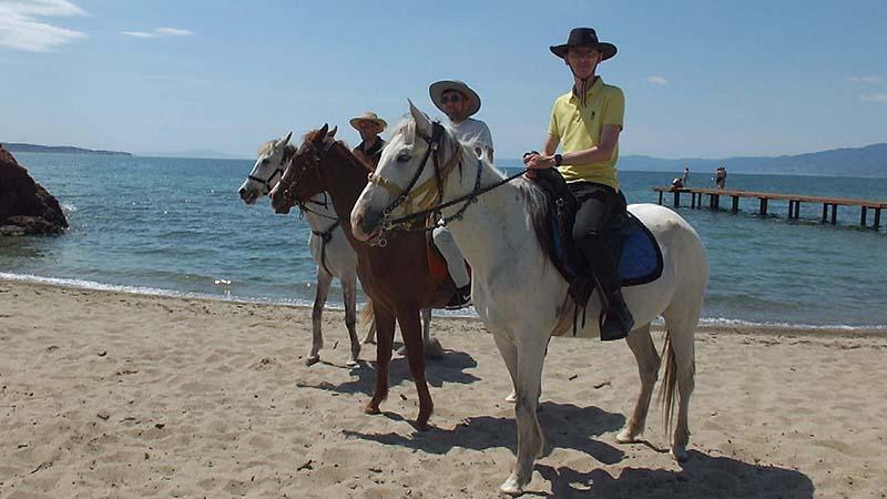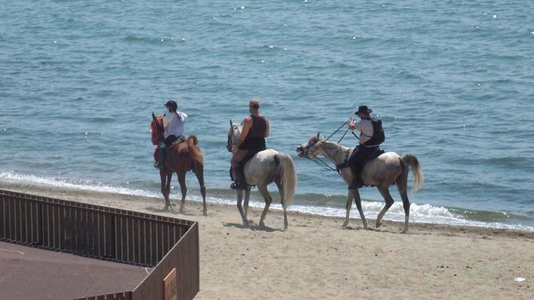 Balıkesir'in Burhaniye ilçesinde deniz sezonu açılırken, Ören Plajı'na atlarıyla gelen 3 kişi ilgi odağı oldu. Gruptaki gençlerden Taner Buyraz (30), ata sporu olan biniciliği yaşatmak istediklerini söyledi.