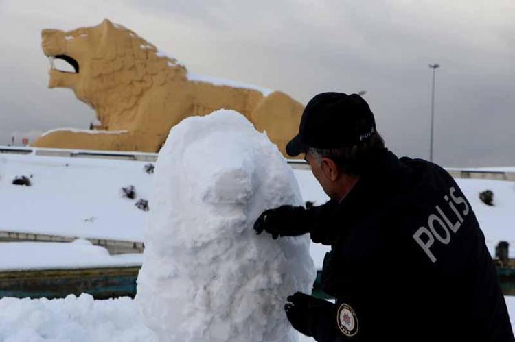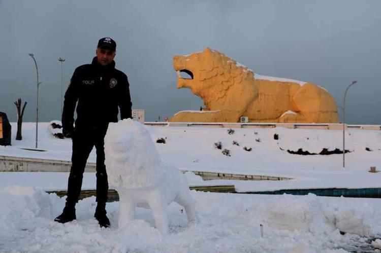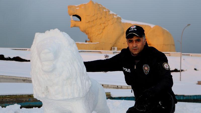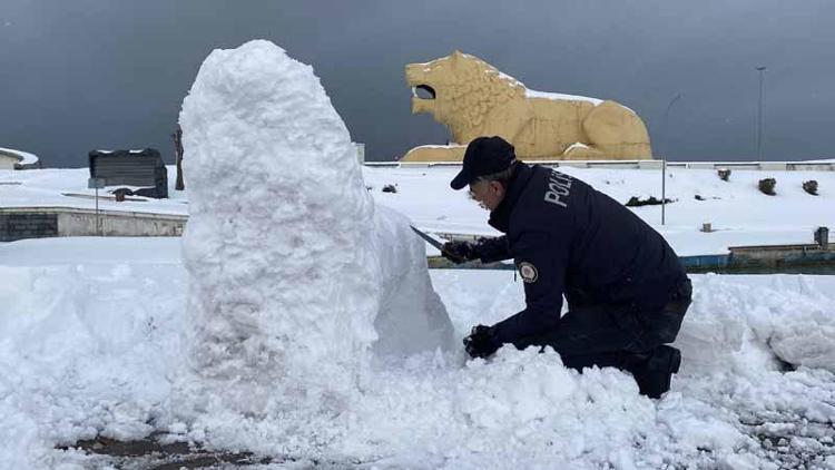 Kızıyla birlikte kardan hayvan figürleri yapan Aşlı, bu kez de aslan figürü yaptı. 24 yıldır polis memuru görevini sürdüren Aşlı, bu figürleri yaparken sadece bıçak kullanıyor.